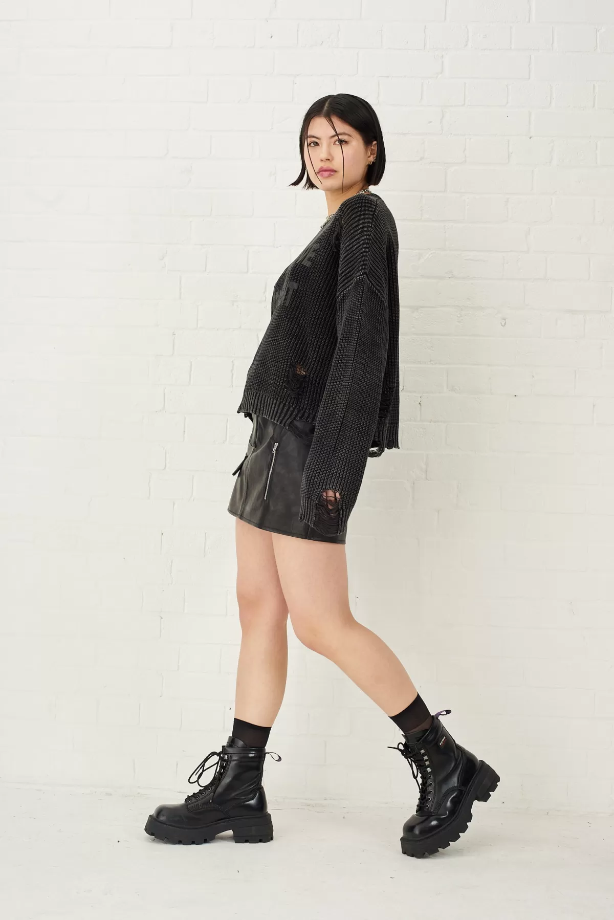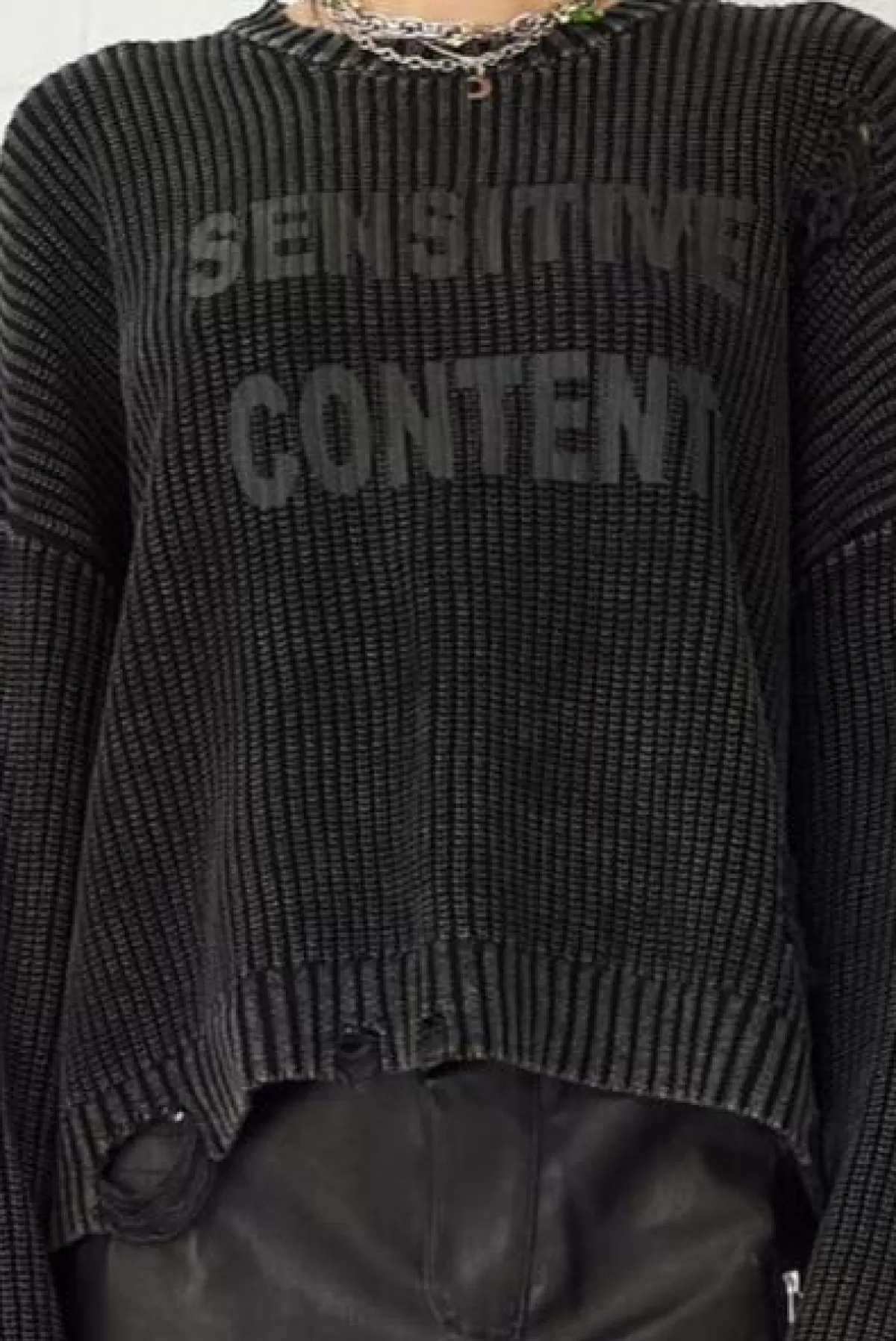 Black acid wash distressed knit with Sensitive Content graphic slogan